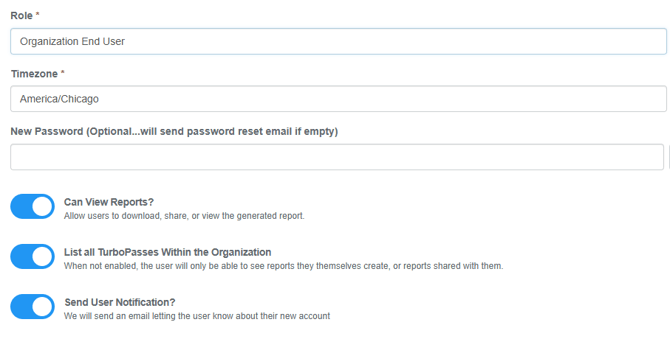 When creating a user inside of the TurboPass dashboard, it's important to assign the correct role to the user. Additionally at the bottom of the create user page, there is a variety of permissions that can be enabled as seen below